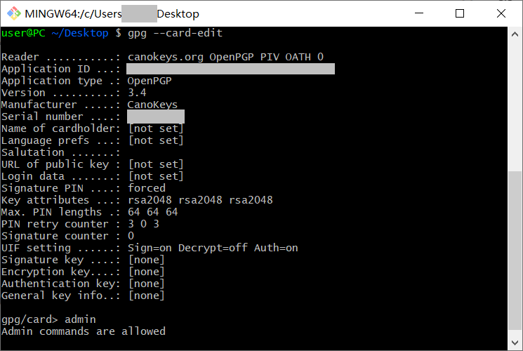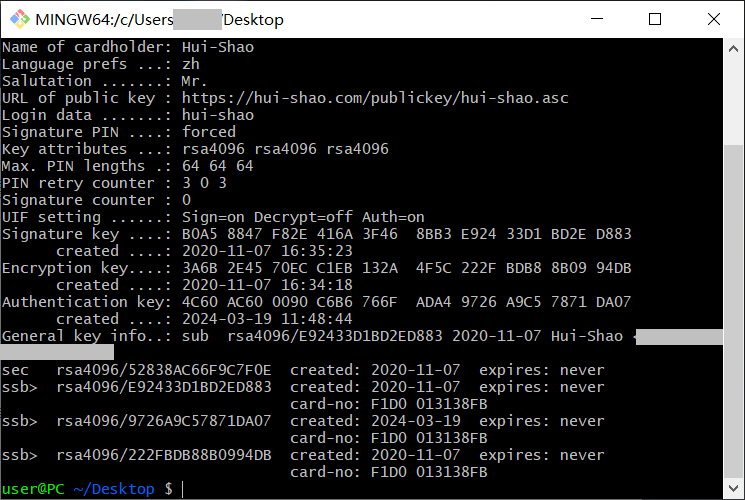可见,私钥已经正确导入到了智能卡中,接下来可以把主私钥删除(做好冷备份的前提下),提高安全性: