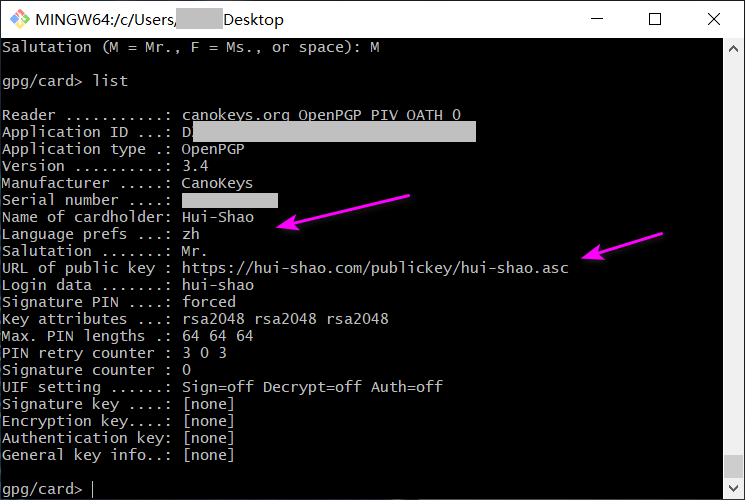 完成密钥保存后,使用 gpg --card-status 读取 Canokey