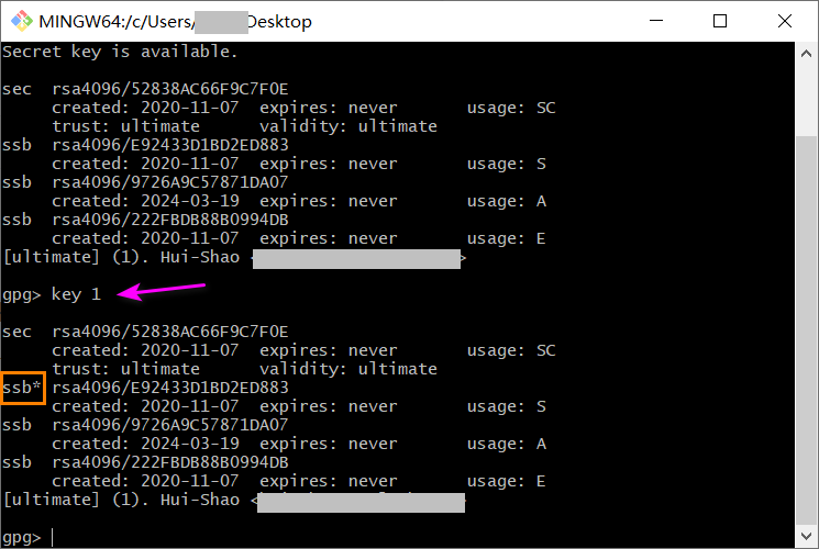 如图,主密钥从sec变为pub,代表仅存储了主密钥的公钥;而子密钥从ssb变成了sub,也代表了子密钥只有公钥。