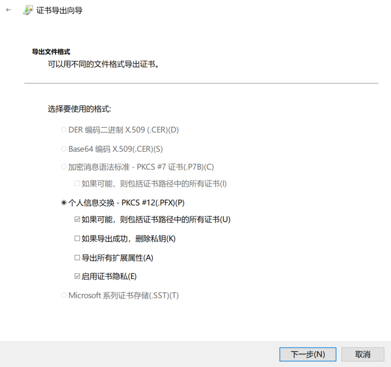 点击下一步,然后选择是,导出私钥,然后再次点击下一步。
