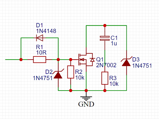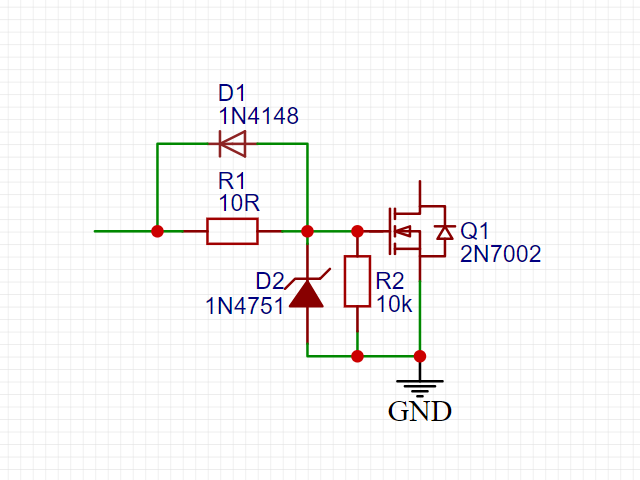 在栅极并联稳压管 D2,以限制栅极电压在稳压管稳压值以下,可以保护场效应管不被击穿。但要注意,齐纳二极管的电容可能有轻微的不良影响。
