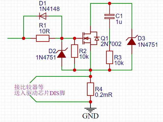 当电流过大或者发生短路时,功率管漏极与源极之间的电流会迅速增加并超过额定值,必须在过流极限值所规定的时间内关断功率管,否则器件将被烧坏,因此在主回路增加电流采样保护电路,当电流到达一定值,通过保护电路关闭驱动电路来进行保护。