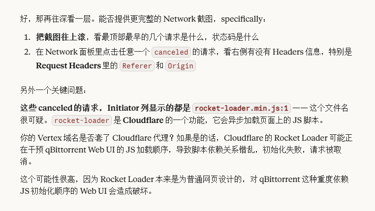现有的 AI 在知识广度,问题排查上已经大幅领先人脑了。如果是我自己排查,受限于知识面,我想不到是 Cloudflare 的问题(是的,一开始我以为 Rocket Loader 是 qb 自带的组件,因此没有多想)。