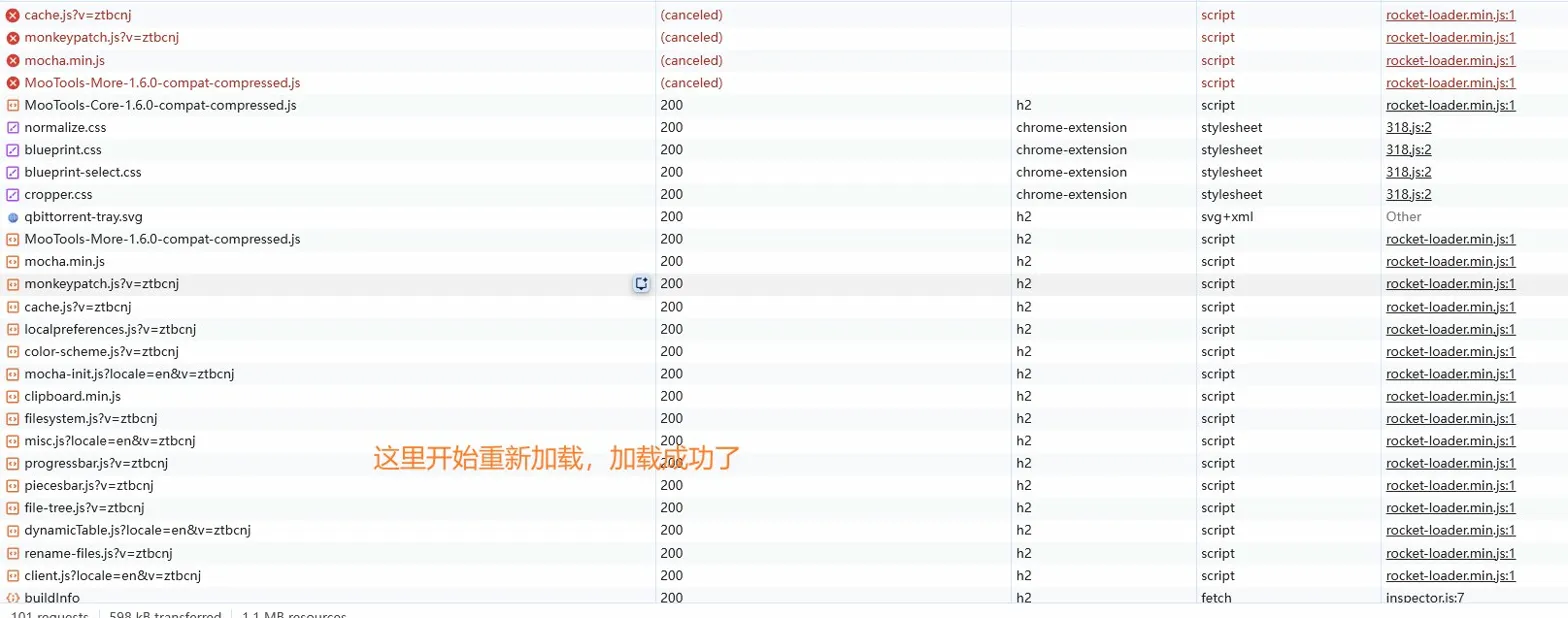 同样的 JS 文件被加载了两次:第一次全部 canceled,随后页面自动触发了一次重载,第二次全部 200 成功。